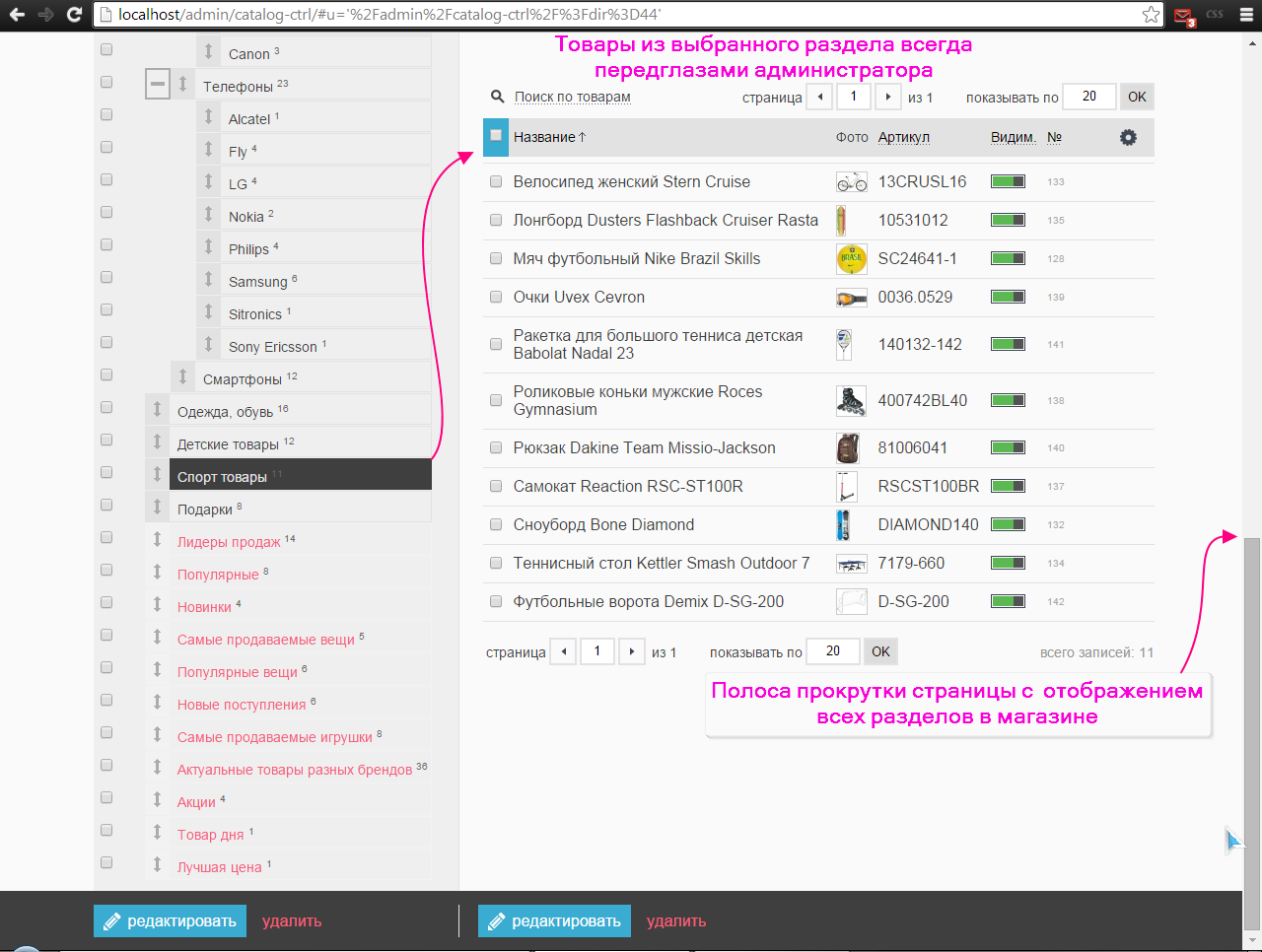 Поэтому предлагаю просто добавить в шаблон Админки "плавающий блок" для вывода товаров из данной категории (раздела).