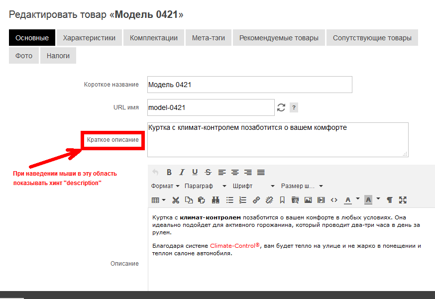 Во всех местах в админке, где добавляются данные, например при добавлении товара, сделать всплывающую подсказку с алиасом (именем переменной, в которой хранится значение), при наведении курсора на лэйбл поля.