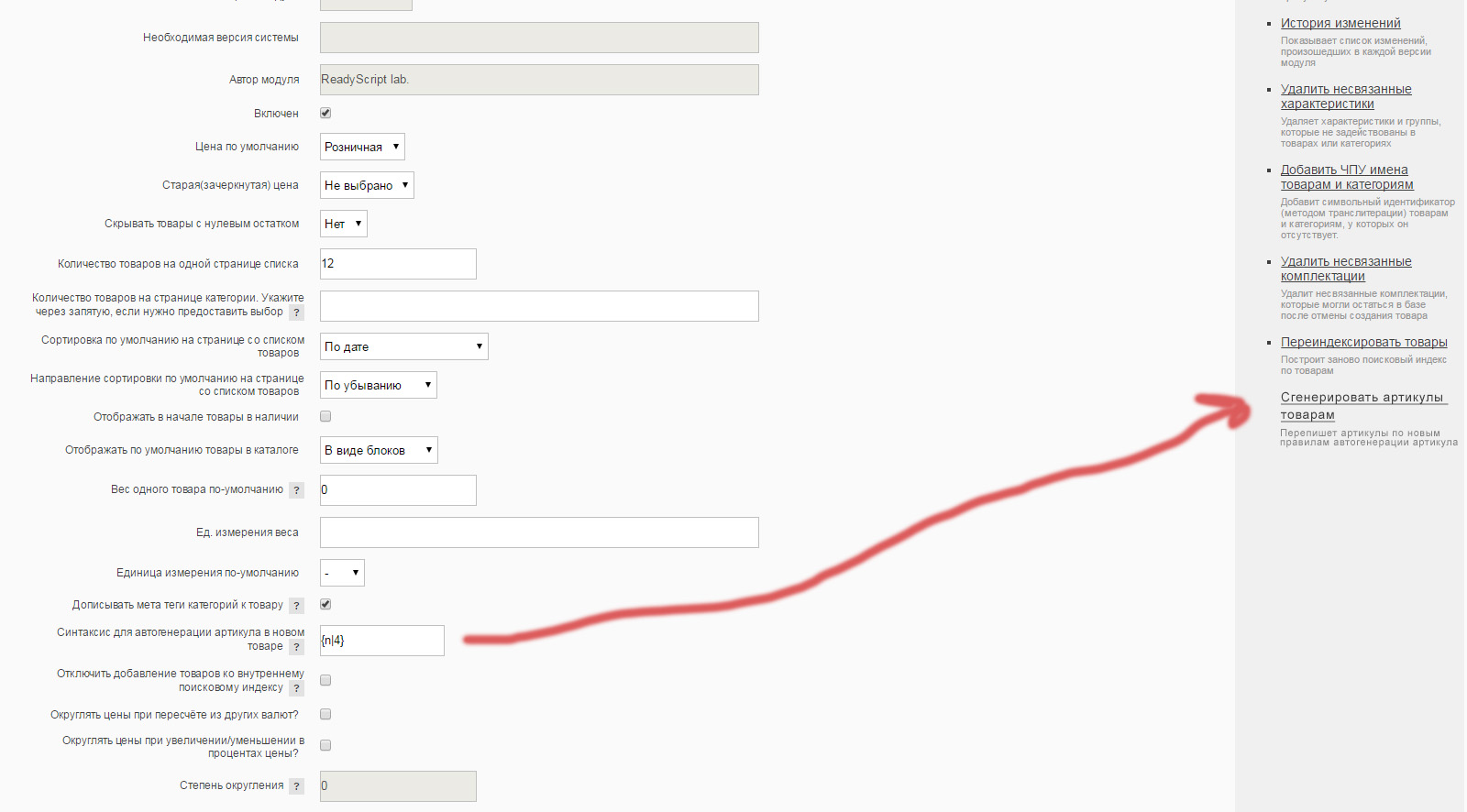 Предлагаю в настройках модуля «Каталог товаров» добавить кнопку, при нажатии на которую, всем товарам пропишутся артикулы, в соответствии с новыми правилами синтаксиса автогенерации