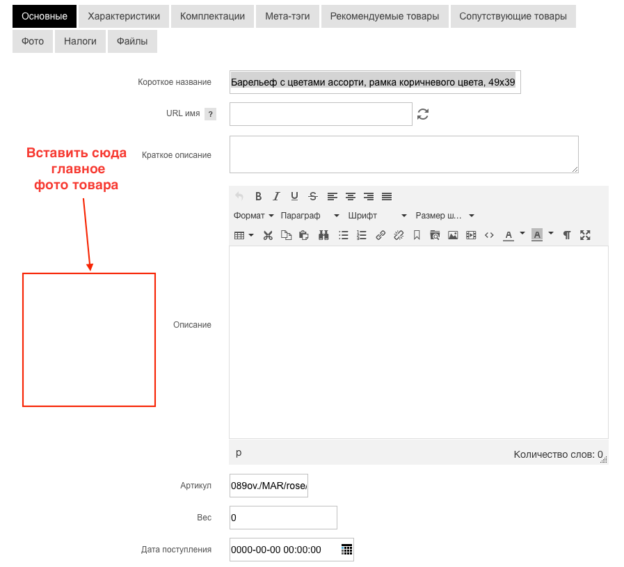 В админке, при редакции товара, открывается окно редактирования с вкладками "Основное, Характеристики" и т.д.