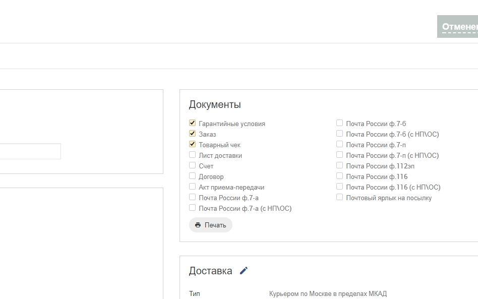 Сейчас из заказа при выборе нескольких документов (например заказ и товарный чек) и отправки их на печать, на печать уходит лишь один документ, прошу доработать этот функционал, и сделать так, чтобы при выборе нескольких документов, на печать выходили все выбранные документы.