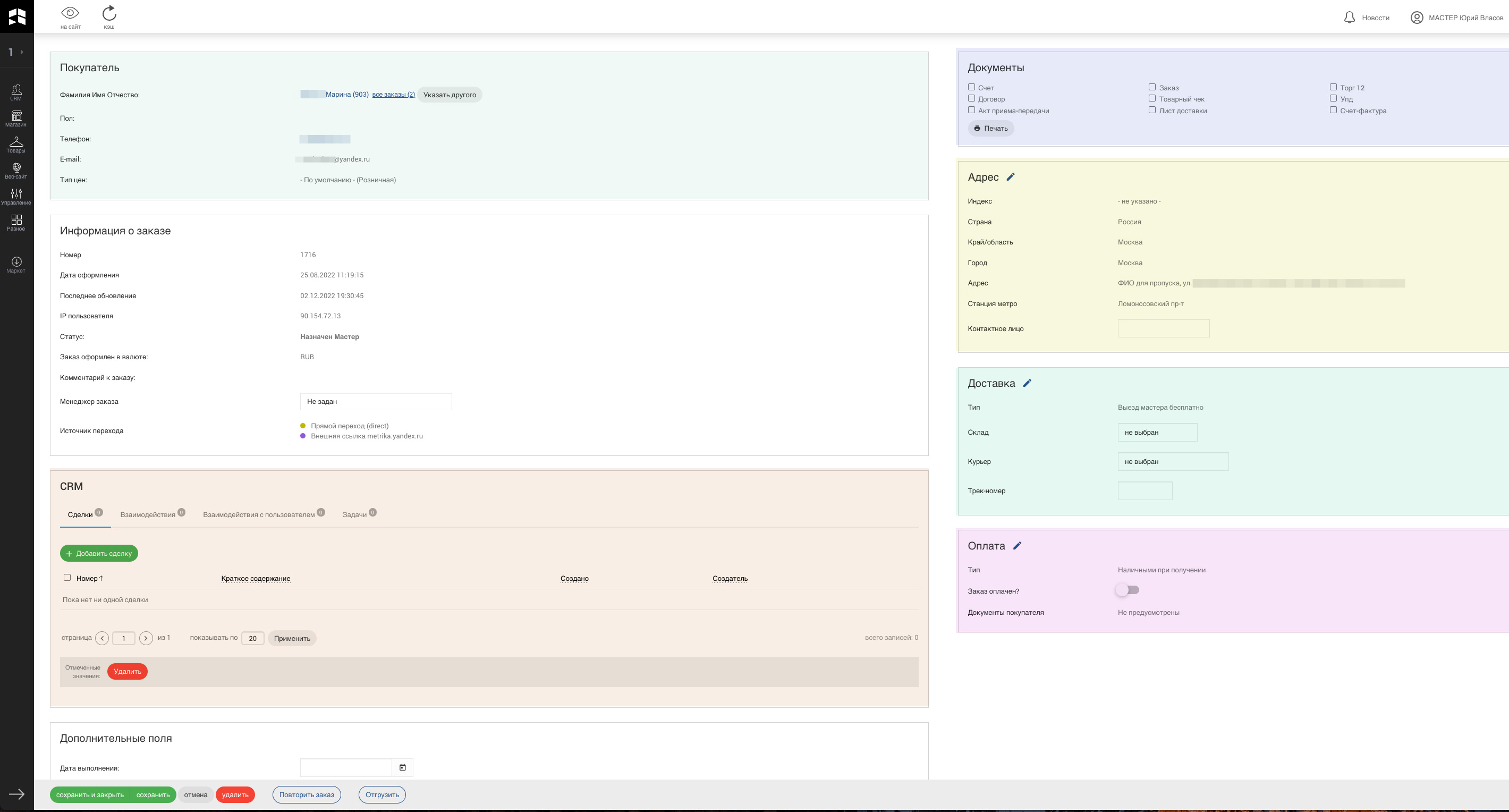 Панель заказа в CRM Админке блоки сделать разными пастельными цветами.