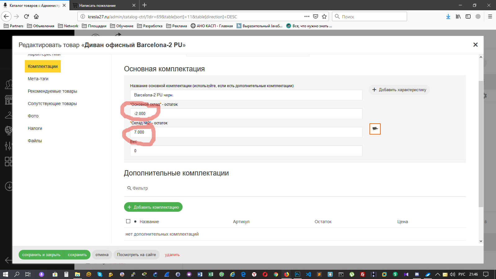 Пользователь заходит на сайт и покупает 5 единиц товара, при этом в readyscript пользователь не может выбрать с каких складов ему списывать товар (оно и правильно). В итоге, создается заказ в админке в котором 5 товаров списаны с основного склада. В итоге, в каталоге товаров мы видим, что у нас осталось 5 товаров (все логично) см.рис.1. Однако, если открыть карточку товара, то мы увидим, что на первом складе стоит -2 товара, а на втором складе по прежнему 7 см.рис2. Курьер забирает 3 товара с основного склада и 2 со второго, при этом он не делает никаких перемещений, а просто отвозит товар клиенту. Потом, если со склада допустим привезли 5 тех же товаров и сделали перемещение, то на первом складе останется 3, а на втором 2, а это не правильно и может и вызывало путаницу в наличии товара.
