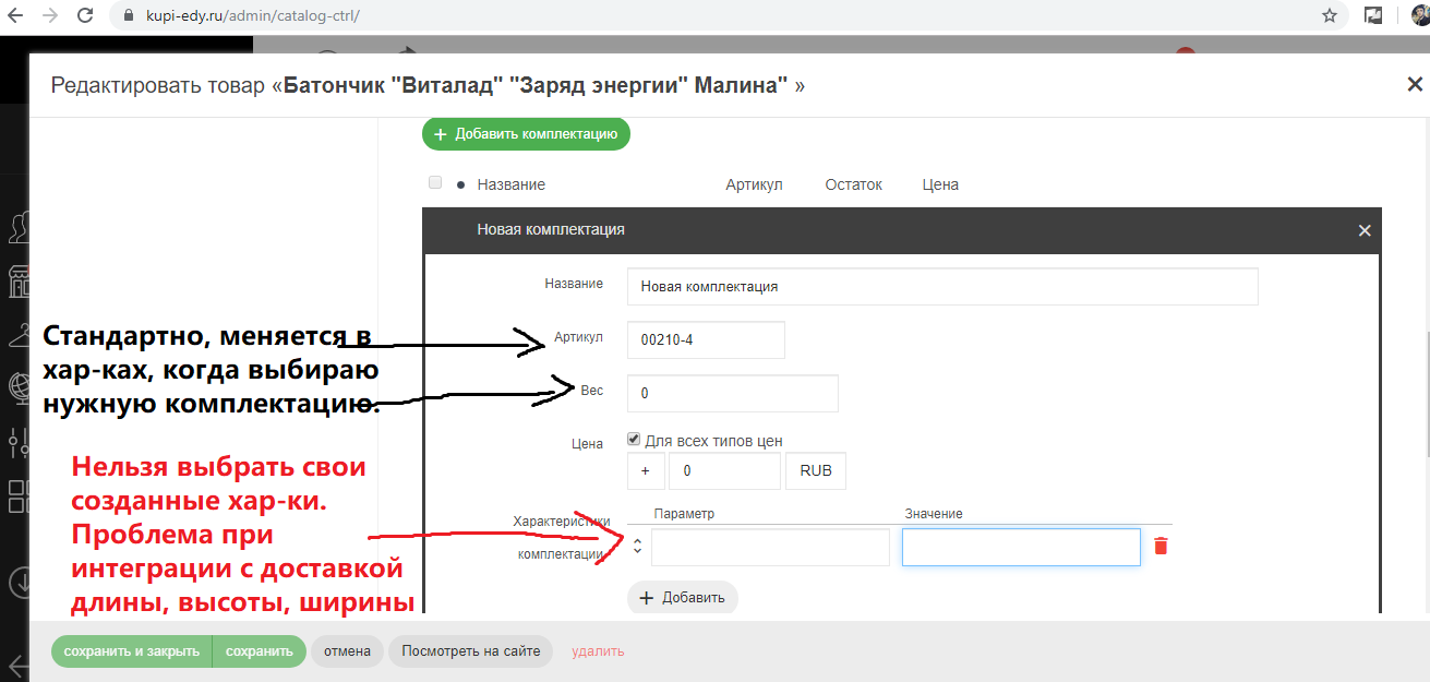 Можно, конечно, добавить свою характеристику в каждой комплектации, но как произвольную характеристику добавить в доставке сдэка или почты России? Каждая хар-ка длина, высота, ширина, которую мы создаем в многомерной комплектации, считается новой и её нельзя выбрать в службе доставки. На данный момент нам приходится создавать по 2-3 набора с каждого товара.