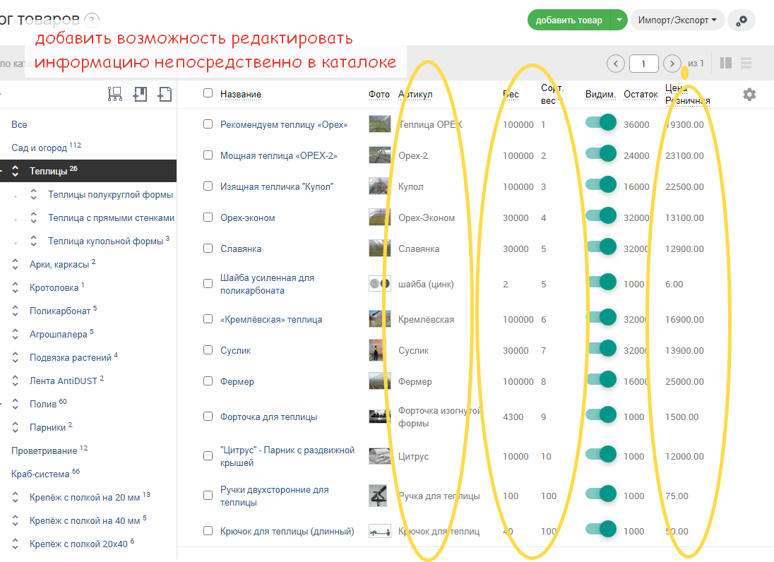 ЦЕНА; НАЗВАНИЕ; СОРТИРОВОЧНЫЙ ВЕС и так далее непосредственно в каталоге товаров. Сейчас чтобы отредактировать цену или вес товара приходится заходить непосредственно в карточку товара. Такую примитивную реализацию не использует ни одна CMS, может пора уже исправить эту ситуацию.